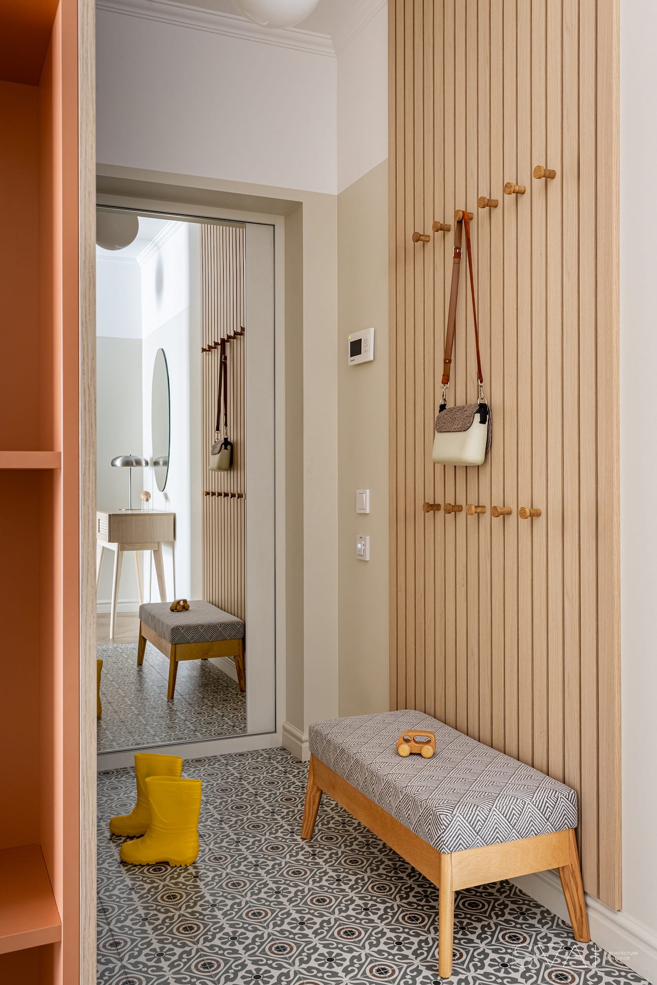 Для организации пространства прихожей с большим гардеробным шкафом мы уменьшили ванную комнату, сместив смежную стену. Помимо шкафа, в прихожей предусмотрели быструю вешалку для верхней одежды в двух уровнях, удобную для взрослых и детей.