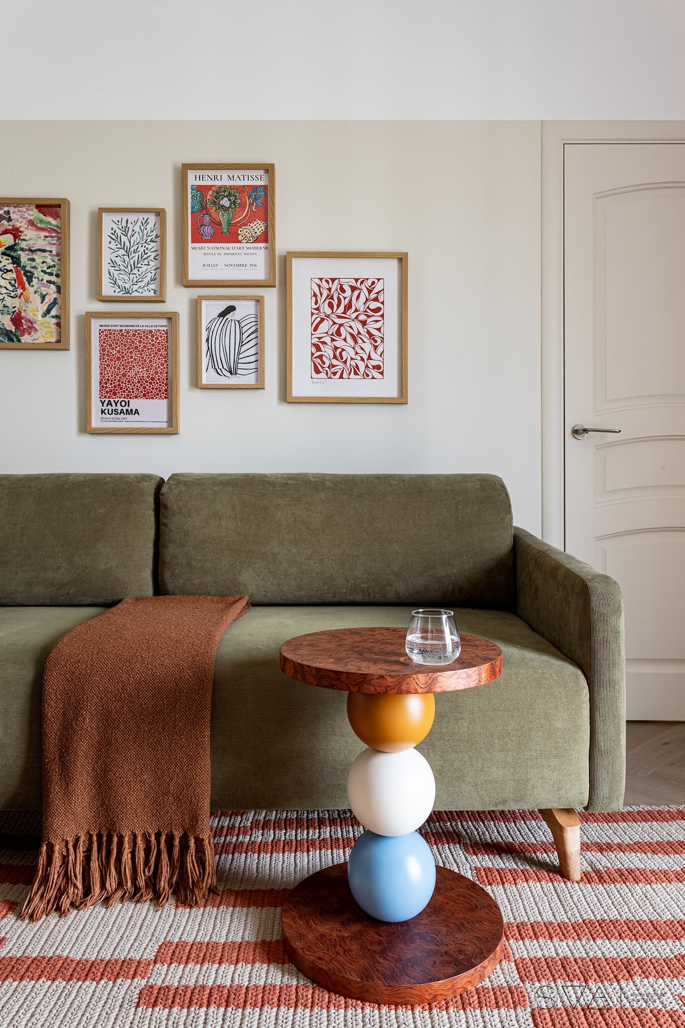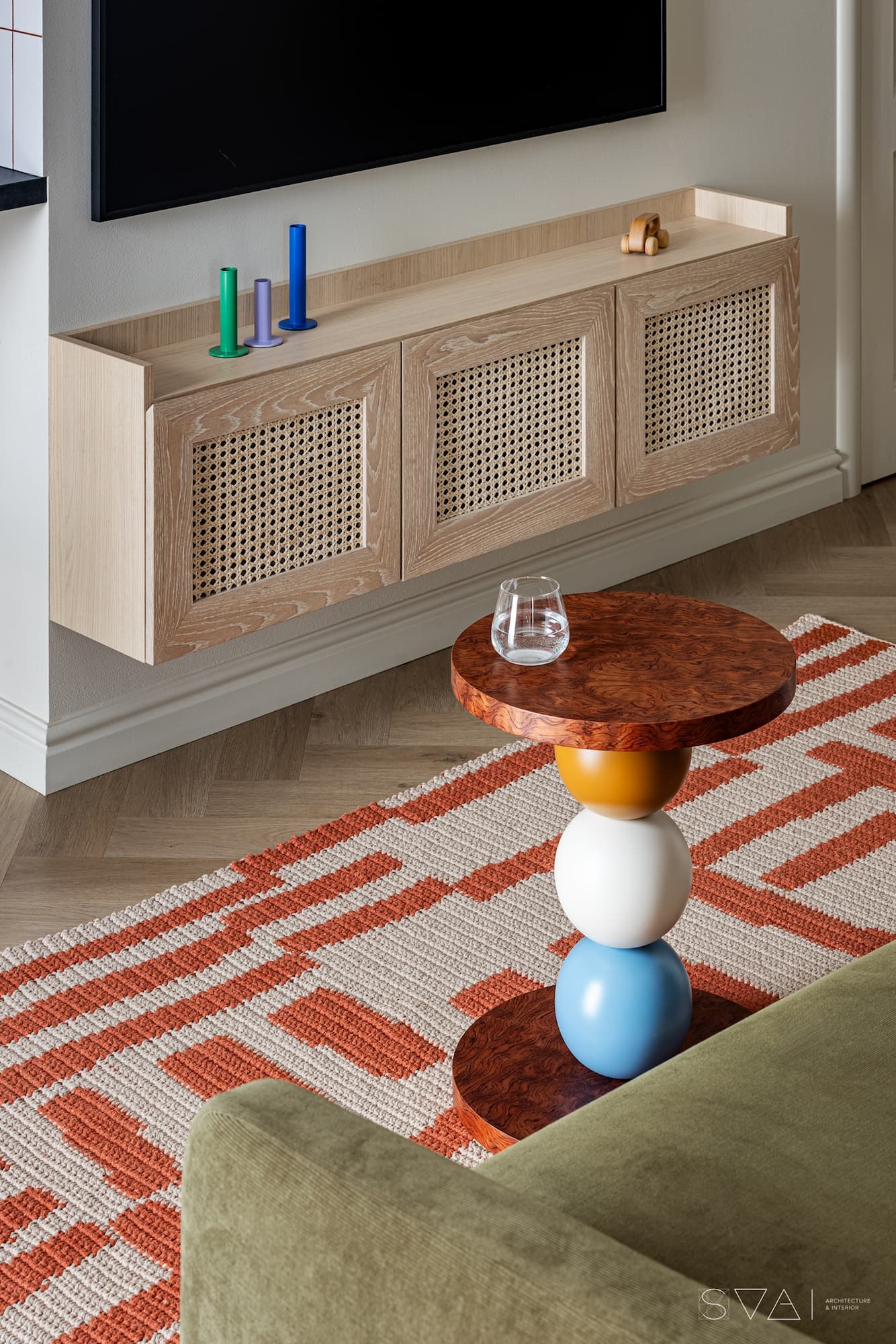 Большие поверхности глубоких насыщенных цветов создают индивидуальную камерную атмосферу для каждого помещения в квартире. Именно в этой камерности приятно разглядывать более мелкие детали интерьера: фигурные потолочные карнизы и плинтусы, отделку из мелкоформатной узорчатой плитки, графичные яркие швы на фоне белого кафеля, ротанговые сетки на фасадах мебели и игривые шары светильников и цветных мебельных ручек, рассыпанных по интерьеру, словно бусины, соскользнувшие с порванной нити.