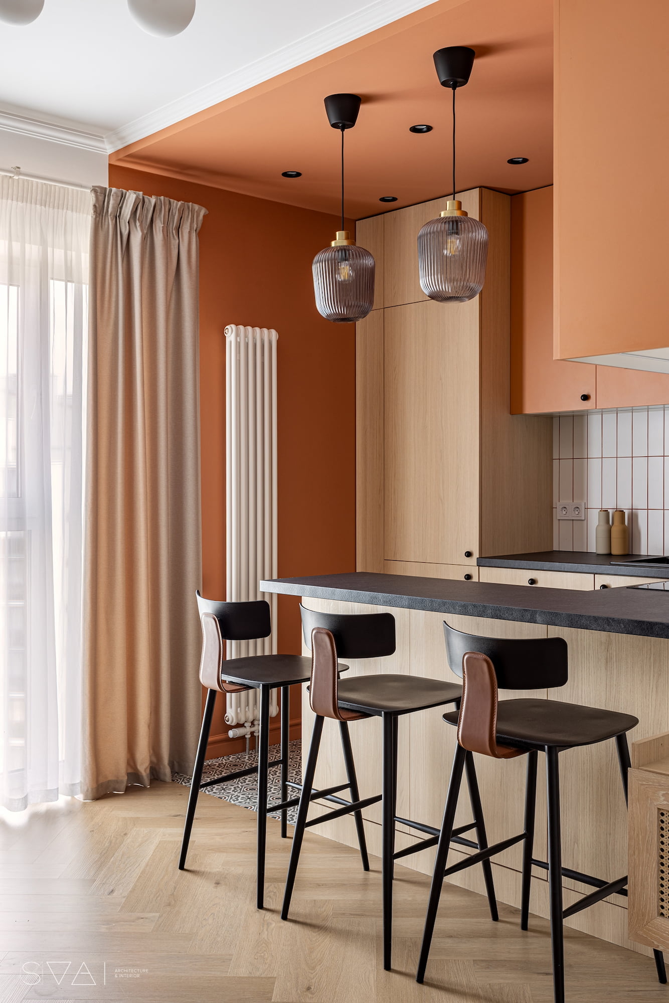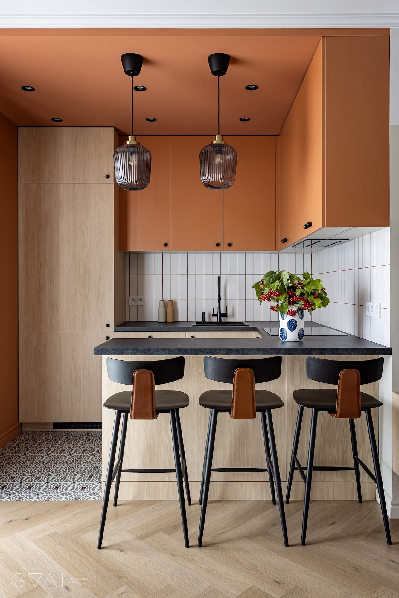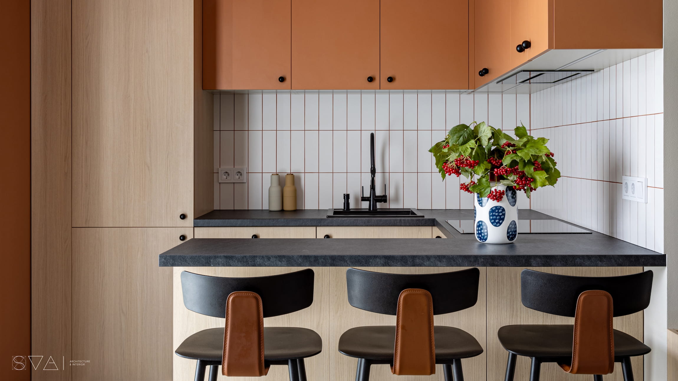 Зона кухни в объединенном пространстве является визуальной доминантой. Несмотря на то, что она физически никак не отделена от гостиной при помощи стен и перегородок, функциональное разделение читается довольно четко. Благодаря спроектированной барной зоне, дизайнерам SVAI Studio удалось увеличить рабочую поверхность компактной кухни и дополнительно зонировать пространство.