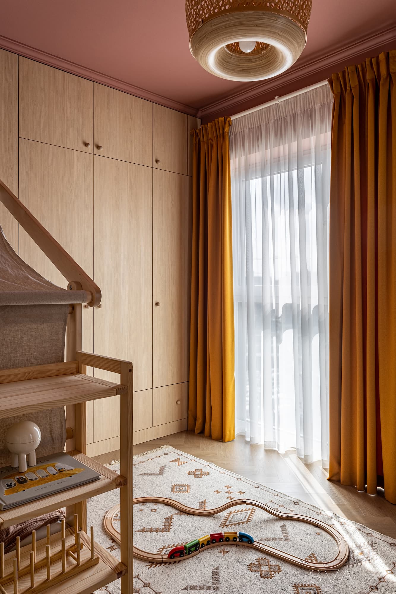 Детская и спальня спроектированы в виде отдельных помещений. Каждая комната оборудована индивидуально спроектированной зоной хранения и зоной отдыха. В детской комнате мы старались сохранить максимум свободного пространства, где ребенок сможет играть в подвижные игры и заниматься творчеством. Завершает образ детская мебель из натурального дерева, которая может трансформироваться и расти вместе с ребенком.
