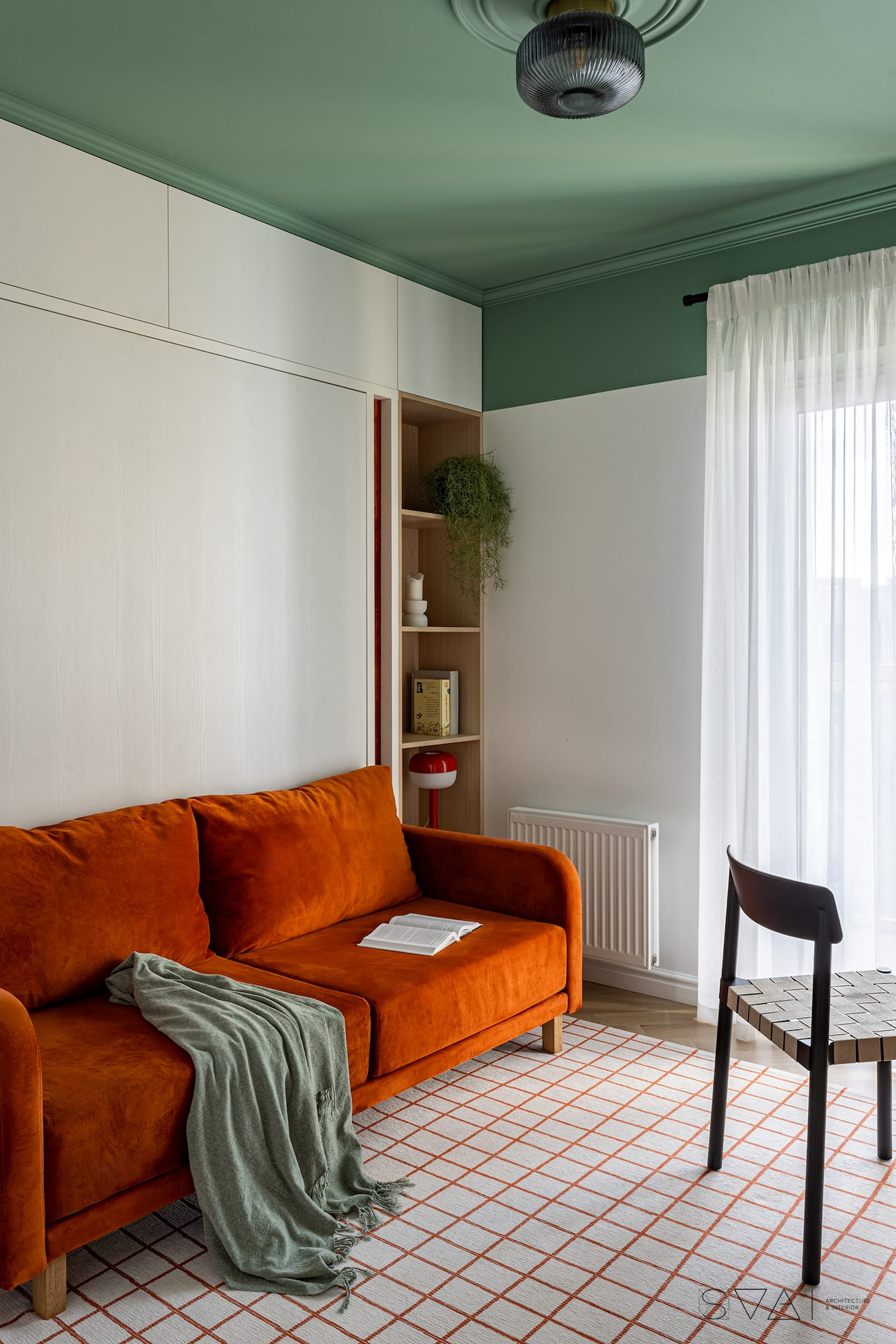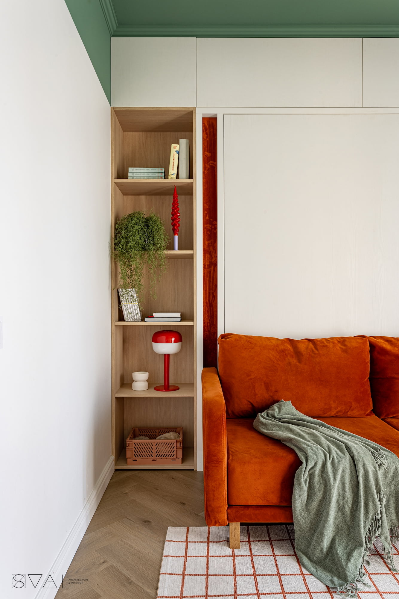 Спальня несет в себе дополнительную функцию рабочего кабинета с небольшим, но эргономичным консольным рабочим столом и системой хранения над ним. В зоне отдыха мы использовали уже имеющуюся у клиентов кровать-трансформер, которую дополнили системой хранения и идеально интегрировали в интерьер комнаты.